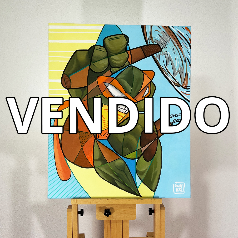 Cuadro pintado a mano de Michelangelo, la Tortuga Ninja más divertida, reinterpretado en el estilo post neo-cubismo. Acrílico sobre lienzo artesanal, perfecto para fans del cómic, coleccionistas y amantes del arte pop.