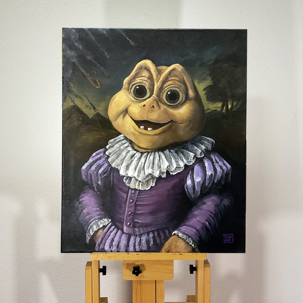 Cuadro pintado a mano que fusiona cultura pop y arte clásico: el icónico personaje de la serie Dinosaurios representado como un noble del Siglo de Oro. Una pieza única para amantes del arte contemporáneo y la nostalgia de los noventa.